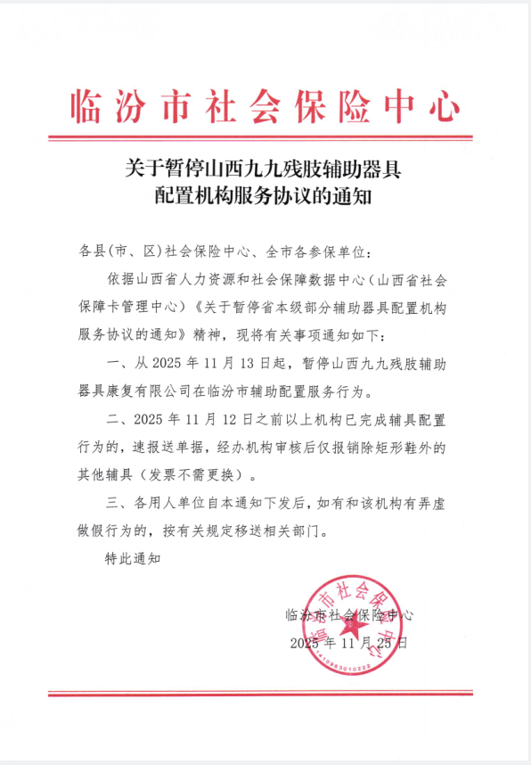 临汾市社会保险中心关于暂停山西九九残肢辅助器具配置机构服务协议的通知