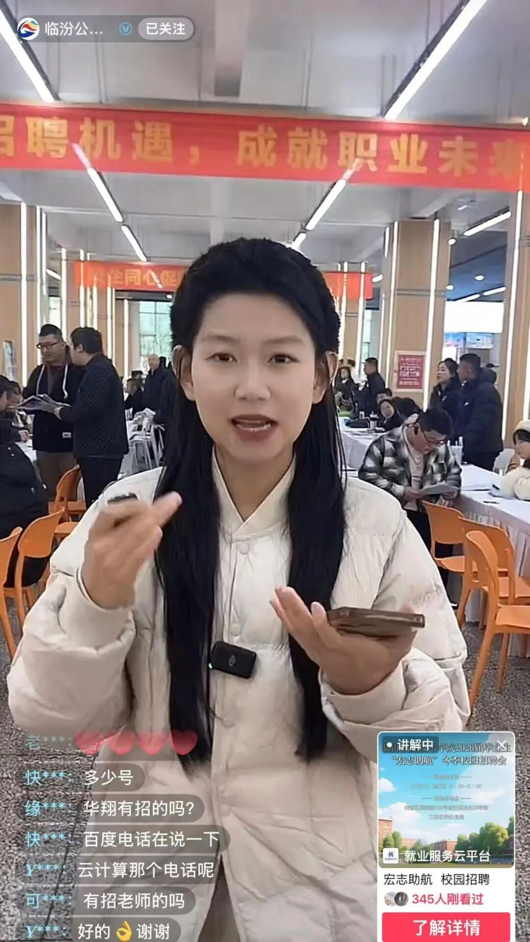 上午9时30分,招聘会正式启动。现场气氛热烈,秩序井然。毕业生们携带精心准备的简历,积极与招聘单位沟通,详细了解岗位职责、薪资待遇、职业发展前景等信息。各企业代表通过展位咨询、宣传资料发放、现场答疑等方式,向毕业生介绍企业概况与岗位优势。会场特设政策咨询与就业指导服务专区,为毕业生提供“求职能力实训营”项目介绍、留临就业创业政策解读等“一站式”贴心服务。据统计,本次活动共吸引求职者730余人次,初步达成就业意向210人。招聘会同步开启线上直播,在短短1个半小时内,抖音平台实现曝光9393人次,观看人数达5086人次;小程序浏览345人,报名28人;网易直播观看量也突破2万人。